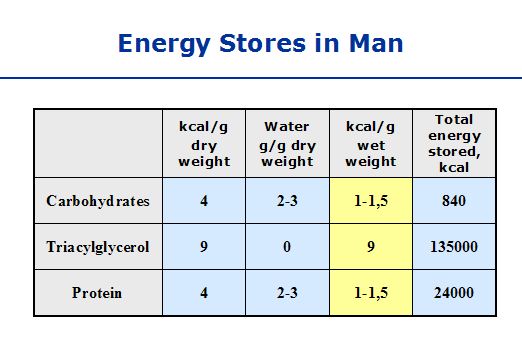 Варианты топлива для человека: белок, запасенные углеводы (гликоген), жиры. Использование белка в качестве источника энергии является весьма ограниченным, если Вы не находитесь в экстремальных условиях. В итоге мы приходим к двум основным источникам энергии – жиры (липиды) и углеводы.