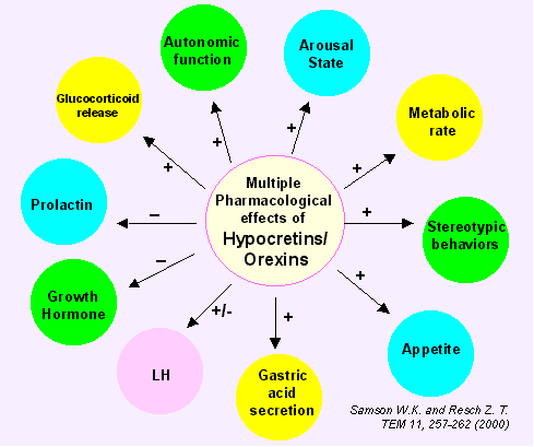Они обладают модулирующим действием по отношению к норадреналинергическим нейронам голубоватого места (locus coeruleus), активирующими эффектами, участвуют в контроле цикла «сон-бодрствование», пищевого поведения, эндокринных и кардиоваскулярных функций. Орексин А повышает локомоторную активность и модулирует нейроэндокринные функции.